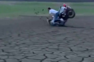 男子骑摩托秀车技,下一秒翻车直接冲进泥里!