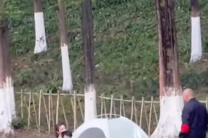 钓鱼人在帐篷旁边接受女子按摩,两名戴红袖章的工作人员过去查看